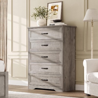 - 【Spacious Storage Space】Measuring 31.5" D x 15.7" W x 43.9" H, this grey dresser features 5 spacious drawers, providing versatile storage for organizing various items such as shirts, underwear, socks, hats, ties, baby supplies, and children's toys. The ample drawer space ensures items are kept sorted and easily accessible, while the spacious top surface is ideal for lamps, decorations, or cherished photos.