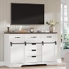 - The sliding barn doors glide effortlessly on smooth tracks, offering quick access to hidden storage. Adjustable shelves with three height options adapt to your needs—store tall vases, baskets, or kids’ school supplies with ease. Perfect for busy mornings or family movie nights when everything needs to be within reach.