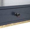 Nothing says class quite like gold. Matching your good fashion sense with functionality, the console table features two drawers for living room or entryway storage. Distressed gold legs with turned accents are sure to be an eye-catcher. An expertly crafted solid mango wood tabletop means lasting quality. Painted a deep navy blue, this gold console table is the perfect addition to nearly every type of decor. Pair with the matching side table for a modern, eclectic furniture set.