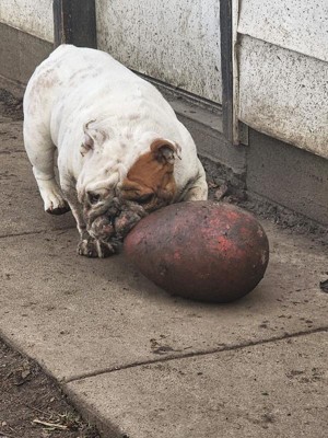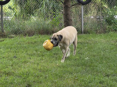 My 10 month old, 100 lb German Shepherd destroyed his Large Egg in 5 minutes. Punctured it, scraped material off it leaving tiny red plastic bits everywhere. We watched him the whole time, and he had a blast! But it’s just not safe for large breeds who can get their mouths around it. Even if you have a smaller breed, but they are an aggressive chewer, steer clear. They can pin the toy against something and use their front teeth and canines to scrape the toy. See the photos of the punctures and scrapes that result in tiny plastic bits being removed. I would have gone with 1 star, but Buddy had so much fun!