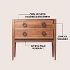 - Transitional dark walnut finish is complemented by ring pulls in a black finish