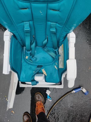 The new Nook has a tray with four depth adjustments to accommodate your child as they grow. Many high chairs lack a big enough seat. Without using two hands or line up cumbersome rails, mom or dad can easily hold their child while operating the tray. There is no need to remove dishes from the tray before taking the child out of the chair. Swing the tray open, unbuckle your child, and off you go to the next task. This feature helps keep your kitchen counter clear.