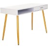 Transform your workspace with elegance and functionality with the Jorja desk. Featuring a chic white and gold design, this desk effortlessly blends style and utility. The spacious surface provides ample room for your tasks, while the practical shelf and drawer keep essentials organized. Crafted from mdf and metal, this piece offers a sleek and modern look that complements any decor. Whether you are tackling work projects or enjoying creative pursuits, the Jorja desk supports your goals with ease and sophistication. Add a touch of glamour and organization to your home or office with this refined furniture addition.