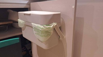A nicely designed piece of kit, as you would expect, which sits neatly on the inside of a kitchen cupboard door and lifts off easily when it’s time to empty. The bags sold to accompany the box are not a perfect fit but stretch enough to go over the lip.