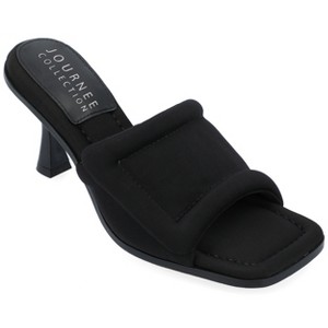 Our Addriel heels from Journee Collection will leave your feet feeling more comfortable than ever while allowing you to walk in style. With their 8 mm � insole neoprene material hourglass stiletto heel toe band style and open square toe you're sure to wear these on repeat. Continuing to keep things simple they're made to slip on and off without a struggle.