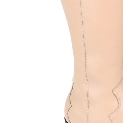 A style from the old west makes a comeback with the Pryse by Journee Signature. This genuine leather western boot features a wide-calf and a 4 mm footbed for a comfortable fit. A low stacked heel and cowgirl-inspired stitch details finish the design.