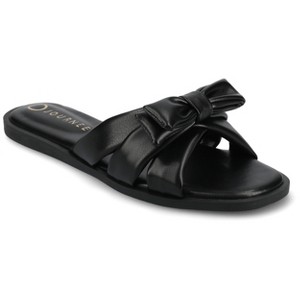 The Prylin slip-on women's sandal from Journee showcases a single band strap with a charming bow accent for a feminine touch. Its open-toe design and faux leather uppers create a chic and versatile look. With a cushioned footbed, the Prylin women's sandal offers both style and comfort for every day of the week.
