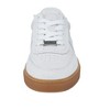 • A: The sneaker features a closed round toe design for a classic appearance.