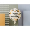This aluminum birthday balloon is round and measures approximately 45cm in diameter. It is printed with the message "Happy Birthday" surrounded by construction trucks and colourful road cones, all on a white background. Perfect for themed parties, it inflates to about 35cm and comes with a straw for easy inflation with air or helium.