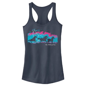 • Strut your stuff with this stylish new juniors' racerback tank top that is perfect for every occasion! Featuring a herd of horses running across the front, the text: "Run wild and free," and a lighting storm in the background.