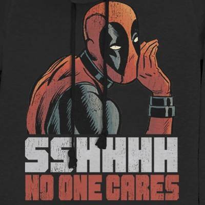 Deadpool only cares about one thing so don't even bug him about anything but the Marvel Deadpool No One Cares Juniors' Cowl Neck. A distressed cartoon Deadpool is featured with "Sshhhh No One Cares" on this cool Deadpool cowl neck.