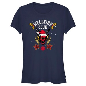 Juniors Womens Stranger Things Christmas Hellfire Club Logo T-Shirt