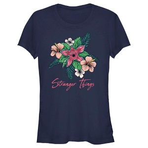 Turn your world upside down with this officially licensed Stranger Things Season 4 Juniors' Graphic T-Shirt! Your favorite 1980s-inspired Netflix television series is taking you back to Hawkins, Indiana to fight the evil creature, Vecna, who is terrorizing Max and other traumatized members of the town! Blast your favorite song and wear this awesome tee to fight the curse of Vecna today. This fun fitted juniors' tee shows off a Demogorgon hidden in a tropical flower arrangement of hibiscus flowers, ferns, and more.