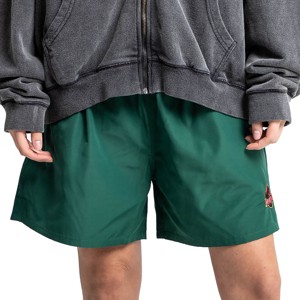 Step into adventure with these adult teal Jurassic Park shorts. Showcasing an embroidered logo on the front, these shorts bring iconic dinosaur park style to your wardrobe. Made with breathable polyester and a mesh lining, they provide comfort for all-day wear. The inside drawstring waistband ensures a secure fit, while side pockets and a back pocket offer convenience. Machine wash them on cold with like colors and tumble dry on low heat for effortless care.