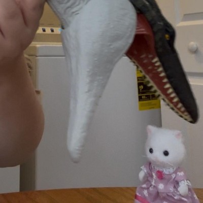 - Spitting image! Hold the tail and press the button again and the Mosasaurus “Blasts” the Dilophosaurus prey back out of its mouth