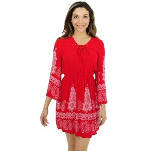 • LOOK SIMPLY STYLISH: Youll love the embroidered look eye-catching paisley boho print that contrasts beautifully with the bold colors. The women swim cover up also comes with a lovely lace up neckline and bell sleeves to make for unmistakably stylish resort wear