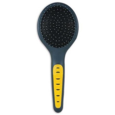 It has a nice solid feel with needle bristle that won't easily bend or fall off while brushing your pets single or double coat. The handle is a good length when brushing underneath your dog's body It leaves my dog's double coat is now looking fresh & fluffy. The size is perfect for all size breeds.