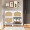 A shoe cabinet combining particleboard and plastic rattan, with 2 flip compartments and high white legs. Measuring 21.3x9.4x38.6 inches, it features a white frame and natural rattan fronts, adding a fresh touch to shoe storage. This well - designed piece not only stores shoes effectively but also adds a touch of class to your living area.