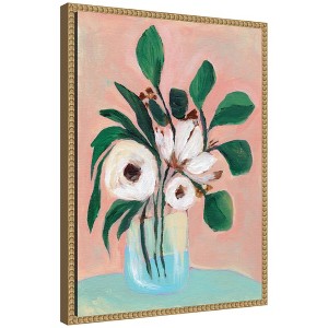 The artwork features a bouquet of white flowers with dark centers and lush green leaves, arranged in a transparent blue vase. The background is a soft, warm pink, creating a soothing and inviting atmosphere. The use of acrylic paints adds texture and depth to the composition. This Kate and Laurel canvas art print was created by Nikita Jariwala and printed by Kate and Laurel in Waunakee WI. This modern floating canvas art is sure to bring joy to your space. Our design team curates art that will fit perfectly in any room of your home. Showcase this art in your living room, bedroom, home office, kitchen, bathroom, nursery, or anywhere you want to bring a little beauty and charm to your walls. Specializing in home decor, we are continually bringing timeless works of art for the traditional decorator as well as trend-forward pieces for that eclectic art lover. Our high-quality framed canvas art also makes excellent gifts for birthdays, holidays, or housewarming parties. Printed on gallery-wrapped canvas and framed with a simple gallery frame this wall art is easy to display on the wall and will match with any decor style. The outside display dimensions are 18 in. w x 24 in. h by 1.6 in. Print Name: "Blush in Bloom"
