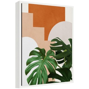 The artwork features large, lush green monstera leaves set against a backdrop of abstract geometric shapes in earthy tones. The contrast between the organic forms of the leaves and the structured patterns creates a harmonious balance. It evokes a sense of tranquility and modern elegance, blending nature with minimalistic design. This Kate and Laurel canvas art print was created by July Art Prints and printed by Kate and Laurel in Waunakee WI. This modern floating canvas art is sure to bring joy to your space. Our design team curates art that will fit perfectly in any room of your home. Showcase this art in your living room, bedroom, home office, kitchen, bathroom, nursery, or anywhere you want to bring a little beauty and charm to your walls. Specializing in home decor, we are continually bringing timeless works of art for the traditional decorator as well as trend-forward pieces for that eclectic art lover. Our high-quality framed canvas art also makes excellent gifts for birthdays, holidays, or housewarming parties. Printed on gallery-wrapped canvas and framed with a simple gallery frame this wall art is easy to display on the wall and will match with any decor style. The outside display dimensions are 18 in x 24 in by 1.6 in Print Name: "Abstract Botanical 2 Leaves"