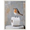 The artwork features a robin perched on a roll of toilet paper, set against a textured, neutral-toned background. The bird's vibrant orange and brown plumage contrasts beautifully with the subtle gray and beige hues. This modern, realistic painting captures the charm of nature in an everyday setting. This Kate and Laurel canvas art print was created by The Creative Bunch Studio and printed by Kate and Laurel in Waunakee WI. This modern floating canvas art is sure to bring joy to your space. Our design team curates art that will fit perfectly in any room of your home. Showcase this art in your living room, bedroom, home office, kitchen, bathroom, nursery, or anywhere you want to bring a little beauty and charm to your walls. Specializing in home decor, we are continually bringing timeless works of art for the traditional decorator as well as trend-forward pieces for that eclectic art lover. Our high-quality framed canvas art also makes excellent gifts for birthdays, holidays, or housewarming parties. Printed on gallery-wrapped canvas and framed with a simple gallery frame this wall art is easy to display on the wall and will match with any decor style. The outside display dimensions are 18 in x 24 in by 1.6 in Print Name: "Bird Standing on Toilet Paper Roll Toilet Bathroom Art"