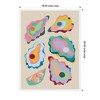 - Art Description: The artwork features abstract oyster shapes composed of layered, vibrant colors on a neutral background. Each oyster shape is uniquely patterned with bold, contrasting hues, creating a lively and dynamic composition. A wedge shape with similar colorful patterns adds a playful touch at the bottom of the piece.