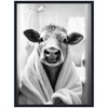 - Art Description: The image portrays a cow wrapped in a fluffy white towel, creating a humorous and endearing scene. Rendered in black and white, the setting gives off a fresh and clean bathroom vibe. This playful depiction highlights the cow's curious and gentle expression.
