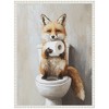 A fox is humorously depicted sitting on a toilet, holding a roll of toilet paper. The painting combines realistic details with a whimsical subject, creating a playful atmosphere. The background is kept simple with neutral tones, highlighting the fox's vibrant fur. This Kate and Laurel canvas art print was created by The Creative Bunch Studio and printed by Kate and Laurel in Waunakee WI. This modern floating canvas art is sure to bring joy to your space. Our design team curates art that will fit perfectly in any room of your home. Showcase this art in your living room, bedroom, home office, kitchen, bathroom, nursery, or anywhere you want to bring a little beauty and charm to your walls. Specializing in home decor, we are continually bringing timeless works of art for the traditional decorator as well as trend-forward pieces for that eclectic art lover. Our high-quality framed canvas art also makes excellent gifts for birthdays, holidays, or housewarming parties. Printed on gallery-wrapped canvas and framed with a simple gallery frame this wall art is easy to display on the wall and will match with any decor style. The outside display dimensions are 18 in x 24 in by 1.6 in Print Name: "Cute Fox Toilet Paper Roll Toilet Bathroom Art"