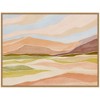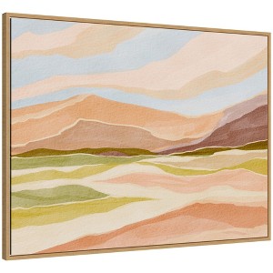 This artwork depicts an abstract landscape of a desert scene with soft, flowing lines and pastel colors. The composition features mountains and hills that blend seamlessly into the horizon. The style evokes a serene and tranquil atmosphere. This Kate and Laurel canvas art print was created by Nikita Jariwala and printed by Kate and Laurel in Waunakee WI. This modern floating canvas art is sure to bring joy to your space. Our design team curates art that will fit perfectly in any room of your home. Showcase this art in your living room, bedroom, home office, kitchen, bathroom, nursery, or anywhere you want to bring a little beauty and charm to your walls. Specializing in home decor, we are continually bringing timeless works of art for the traditional decorator as well as trend-forward pieces for that eclectic art lover. Our high-quality framed canvas art also makes excellent gifts for birthdays, holidays, or housewarming parties. Printed on gallery-wrapped canvas and framed with a simple gallery frame this wall art is easy to display on the wall and will match with any decor style. The outside display dimensions are 42 in x 32 in by 1.6 in Print Name: "Desert Dreams"
