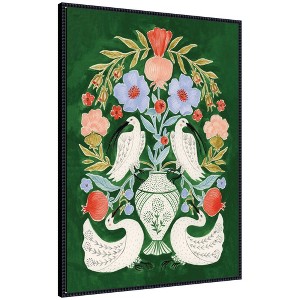 - Gallery Quality Art: Measuring 28 x 38 inches, this is beautifully presented in Sylvie Beaded Black frame - a vintage float frame featuring a traditionally beaded ornate design with black coloring, subtle antiquing and dramatic depth.. Expressive Wall Art Story:The artwork features an intricate arrangement of two stylized white birds and colorful flowers set symmetrically around a central decorative vase. The background is a rich green, enhancing the vividness of the blues, pinks, and reds in the floral elements. The composition exudes a harmonious and ornamental aesthetic.
