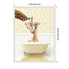 - Art Description: The artwork depicts a whimsical scene of a baby giraffe enjoying a bubble bath in a yellow bathtub with an adult giraffe leaning in tenderly. The background features a playful yellow and green fruit-themed wallpaper. The floor and lower wall are adorned with white paneling and a bright yellow rug adds to the cheerful atmosphere.