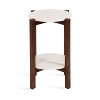 The Moxley is for the transitional modern decorator that craves functionality within their aesthetically-pleasing home. This beautiful side table features two beautiful, authentic marble tabletops for a refined look. Handcrafted in India, each Moxley table contains variations in marble veining, making each piece one-of-a-kind. Your Moxley table also boasts walnut brown wood legs that blend well with almost any space. This end table is the perfect size for flanking your entryway, bed, or couch, measuring 16 inches in diameter by 22 inches tall. Use the top tier as a display surface for decorative accents like a drink with coasters, succulents, an alarm clock, or candles while using the lower shelf to store small household items like books and more. Regardless of where and how you use this beautiful side table, you can rest easy knowing your hardwood or tile floors are protected from damage with the rubber pads attached to each foot. Finally, assemble the stunning Moxley in a matter of minutes with the streamlined 3-step assembly process.