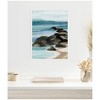 - Art Description: The artwork depicts a serene coastal scene with a sandy beach and large rocks jutting out into the ocean. The watercolor technique creates soft blends of blue, green, and brown, capturing the tranquil essence of the shoreline. The horizon is visible in the distance, adding depth to the scene.