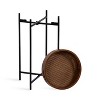 Looking for a versatile and stylish accent table that can complement any room in your home? Look no further than the Kate and Laurel Smita round accent table! One of the standout features of this tray table is its removable wooden tray tabletop, which makes it easy to clean and provides a convenient spot for holding drinks, snacks, or small items like your phone or keys. The walnut tabletop is crafted from solid mango wood, giving you a resilient tray that features a natural woodgrain. Measuring 13.75 inches in diameter by 23.5 inches high and featuring a beautiful satin black base, this transitional small side table is perfect for adding a functional accent to your living room, bedroom, or any other space where you need a bit of extra surface area. The removable tray also features an inset woven cane texture, giving your items more security and your decor an additional touch of refinement. And with its elegant and modern design, it's sure to be a conversation starter and a focal point in any room. So why wait? Add this versatile and stylish accent table to your home dcor today!