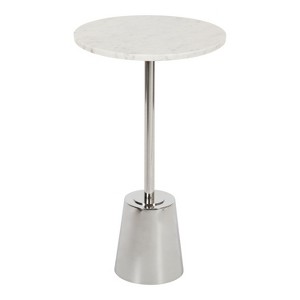 [This review was collected as part of a promotion.] This side table is absolutely stunning. The top is a heavy marble and bottom is a weighted base that feels stable on my hardwood floors. The marble is a neutral white and does not have aggressive veining. I like that it has subtle veining that feels elegant. It provides a soft look that compliments the clean lines of the base. The silver color of the base is striking and modern. It pairs beautifully with modern or transitional styles, and would also be a nice balance in a more feminine space. The size of the table is perfect for a drink or decorative accent, and is perfect at the end of a sofa or next to a side chair. The simplicity of this table contributes to its timeless look and elevates my living space. I love this table!