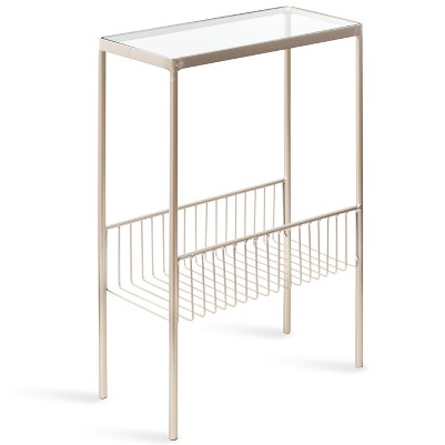Add the contemporary Trubey side table to your elegant modern home decor. This table combines modern sophistication with pure practicality, featuring a sleek, mirrored glass top and a convenient bottom storage rack. Use it to store your favorite novels, magazines, tablets, and reduce the clutter in your home. It fits perfectly between the living room couches or next to the loveseat with its smaller stature and simple design. However, it's not exclusively made for the living room; use it as a minimalist table in your bedroom or as a place to store mail in your entryway. With its clean, gold look and modern style, the Trubey side table blends seamlessly with any contemporary decor. And with its padded feet, you can move this table around the room without the risk of scuffing your beautiful floors. With its gorgeous minimalistic design and useful functionality, the Trubey side table will be the perfect place to set your morning coffee or store your favorite reading materials.