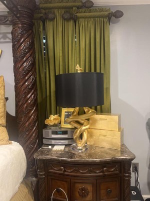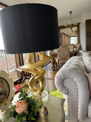 Add a luxurious touch to any space with this gold leaf finish table lamp. From the Kathy Ireland collection of lighting, the lamp base features an organic-shaped, abstract form. The curving, twisting base design comes in a gold leaf finish and is accented by a clear round pedestal base at the very bottom. Up top, a black opaque lamp shades adds a classic touch and helps cast light up and down. Add a luxe modern look to any space with this handsome design.