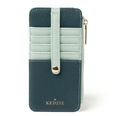 The Kedzie Essentials Only Zippered Wallet is a perfect blend of style and functionality, crafted with textured vegan leather for a sophisticated look. It features a convenient exterior ID window for easy access, a zippered cash pocket to keep your currency secure, and five built-in card slots to neatly organize your cards. Designed with a security strap that boasts a snap closure, this wallet ensures your essentials are safely tucked away. The neutral cheetah print lining adds a touch of chic elegance, while the smooth-glide resin zippers with a branded pull offer a seamless opening and closing experience. Measuring 3.5 inches wide, 6.75 inches high, and 0.5 inches deep, this wallet is both compact and practical, making it an ideal accessory for everyday use.