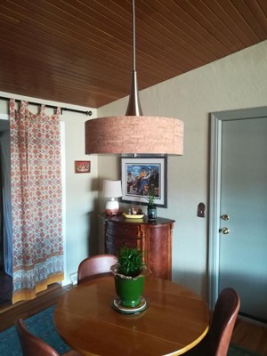 This lamp has brought my dining area into the 21st century. The most dramatic change has been in the wattage, I went from 100W to 300W. The diffused light throws a warm glow through my dining and living room areas. The cork shade fits perfectly with my more relaxed décor.