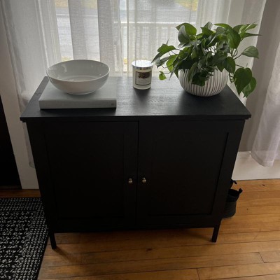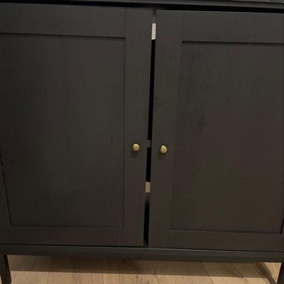 This piece is about what I expected. Not high-end in quality but affordable, functioinal and nice looking. The piece took two people, with a drill, about one hour to assemble. It is possible to make the doors line-up at the top but it does take some fussing with the hinges. There is more space between the doors than I'd like and some at at the top of the doors as well. From the angle it's viewed and with the black enterior, it's not obvious there is a large gap between the doors. We put a motion detecting strip of lights inside the cabinet so when the light is still on, and the doors are closed, the gaps are noticiable (first pic). You must use the interior shelf with this piece or the doors will not be flush with the top and bottom. It is designed so that the doors rest on the interior shelf, making them flush.