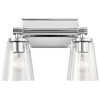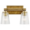 With a clear crystal tube as its centerpiece, the Audrea collection 2-light bath light combines a popular Natural Brass finish and other materials for maximum visual effect. The look draws on the popularity of Lucite accents found on furniture, hardware and other home decor pieces. Material: Steel, Finish Color: Natural Brass, Width: 14.25", Height: 9.5", Depth: 6.25", Height From Outlet Box: 2.25", Backplate Width: 9", Backplate Length: 4.5", Lamping Type: Incandescent, Number Of Bulbs: 2, Wattage: 75 Watts, Moisture Rating: Damp Rated