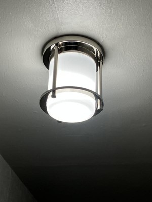 [This review was collected as part of a promotion.] I have been needing a more modern light in my hallway and this one was perfect. It is more modern than what I had and mixes well in my 1940s home. This fixture was easy to put together and is a wry nice quality. In about 30 minutes we had the old one down and this new one up. I love the opal glass and nickel finish. It really looks nice in my space.