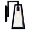 Collection: Delison, Material: Aluminum, Finish Color: Black, Width: 8", Height: 14", Depth: 10", Height From Outlet Box: 6", Backplate Width: 5.5", Backplate Length: 1.18", Lamping Type: Incandescent, Number Of Bulbs: 1, Wattage: 100 Watts, Moisture Rating: Wet Rated, Desc: An updated interpretation of the minimalist Arts and Crafts style, this outdoor wall light in Black from Delison� delivers pure and durable craftsmanship. With its clean, crisp lines and elongated trapezoid silhouette, Delison� is ideal for rustic or updated lodge exteriors. Clear tempered glass in a trapezoid shape lets this light shine bright. Takes one E26 medium base max 75W incandescent bulb or LED equivalent, not included. Its Black finish complements a variety of exterior architectural styles. Perfect for an exterior wall like a front or side entrance, garage or patio. This updated interpretation of the tapered silhouettes of the Arts and Crafts movement make this ideal for almost any style. Compl