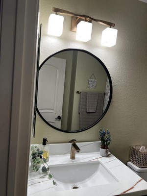 [This review was collected as part of a promotion.] I love the look of this three light vanity. It provides a soft warm glow to any bathroom and makes the room look lovely! It is a simple but modern design that will look great with any decor. I like that you have the option of mounting the fixture right side up or upside down. Either way looks good and totally up to you to decide. Overall I am very happy with mine and think it is just beautiful!
