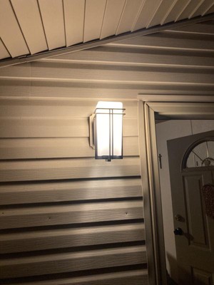 [This review was collected as part of a promotion.] We have been in the process of remodeling our front porch to give it an updated look, and this light was the perfect addition to our renovations. The sleek matte black frame creates a modern, stylish look and the etched glass is a nice touch for providing soft, welcoming light. Even with the etched glass, this light fixture provides much more light than our old fixture did. Installation was straightforward and easy, and took approximately half an hour. I also love how simple it is to change the lightbulb with this fixture. Overall, a great wall fixture to update any outdoor living area!