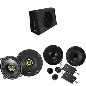 This bundle features top-notch audio solutions: the Kicker 6.5-Inch Component System, the 10" Powered Subwoofer Enclosure, and the 5.25-Inch Coaxial Speakers. The Kicker 46CSS654 Component System includes titanium tweeters, tweeter level control, and EVC™ technology for enhanced bass response. With a peak power of 300 watts and a frequency range of 35-21k Hz, these speakers offer precise control and stunning musical realism. The Kicker 11PT250 BassStation Powered Subwoofer boasts a heavy-duty subwoofer, a tough enclosure, and a digital amplifier for intense bass performance. It also features a remote bass control, adjustable crossover, subsonic filter, and high- and low-level inputs. The Kicker 46CSC54 Coaxial Speakers, with a peak power of 225 watts, offer excellent reliability and precise acoustic control with features like zero-protrusion tweeters, EVC™ technology, and UV-treated foam surrounds. These 2-way speakers have an effective frequency range of 45-20k Hz and a sensitivity of 90 dB, providing superb clarity and increased volume in high frequencies. Upgrade your audio experience with this high-quality bundle that delivers remarkable performance and ultra-clean bass, making it the perfect choice for your vehicle.