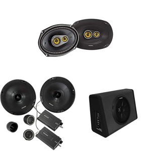 - This bundle includes a Kicker 10" Powered 100-Watt RMS Loaded Enclosure, a 6.75-Inch Component System with .75-inch tweeters, and a 6x9-Inch 3-Way Speakers, all from Kicker.
