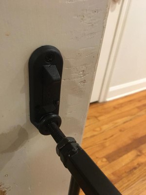 [This review was collected as part of a promotion.] This is a very secure gate. We tried a tension mount walk through gate but the little guy could move it. The hardware mounted gate is much more secure. I was worried the screws would put huge holes in my banister. They are not huge but are very secure. It is very easy to operate and walk through carrying the little guy. I also appreciated the fact it was a darker color. To me it blends in more than bright white.