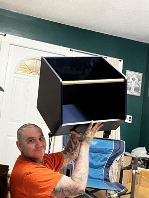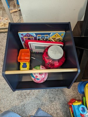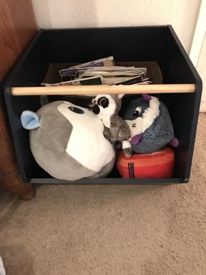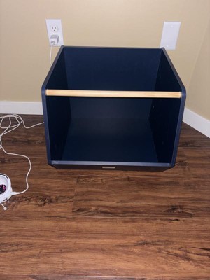 So, not exactly what I had been expecting. I got this from Hey Bullseye in exchange for an honest review. Due to lack of preview image and product description cut off, I thought I was getting a bin that would go on existing shelves. Rather I got an open front bin that required assembly. Assembly, ranked up with a well known foreign brand as far as ease of reading directions. I was able to assemble on my own with a small screwdriver. It was missing a dowl, but with some careful planning, I skipped out on the back. With the open front and low front wall I have little hope of it containing the toys kept on hand for the littles. Also, design states DO NOT STACK, leaving the top open for the dogs to play. The blue color goes nicely with my HP themed library as planned. This is where the littles hang out to play.