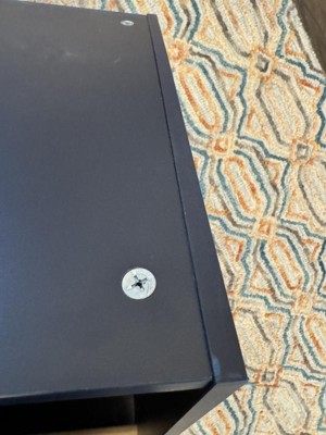 Large sturdy storage bin in a beautiful navy color that goes well in my son’s room. They can scratch fairly easily and show dust. This was pretty easy to assemble and can hold a lot of things. I haven’t tried stacking another one but would need to anchor it to a wall if I did, as they are heavy and wouldn’t want them to fall on a child.